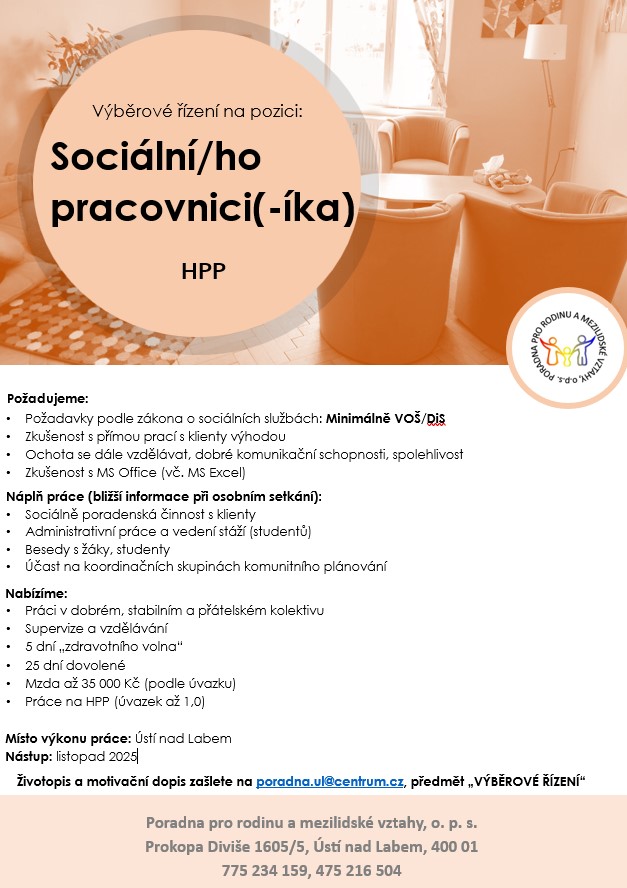 Poradna pro rodinu a mezilidské vztahy, o. p. s. plní funkci manželské a rodinné poradny. Poradna poskytuje sociální službu odborného sociálního poradenství a působí v oblastech harmonizace a posilování rodinných, partnerských a mezilidských vztahů.